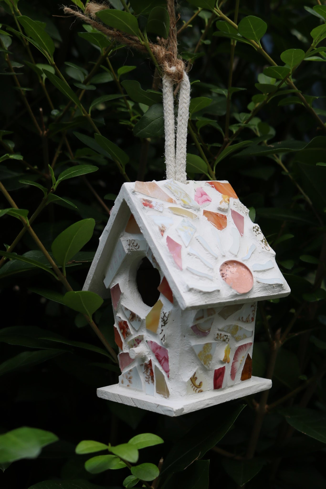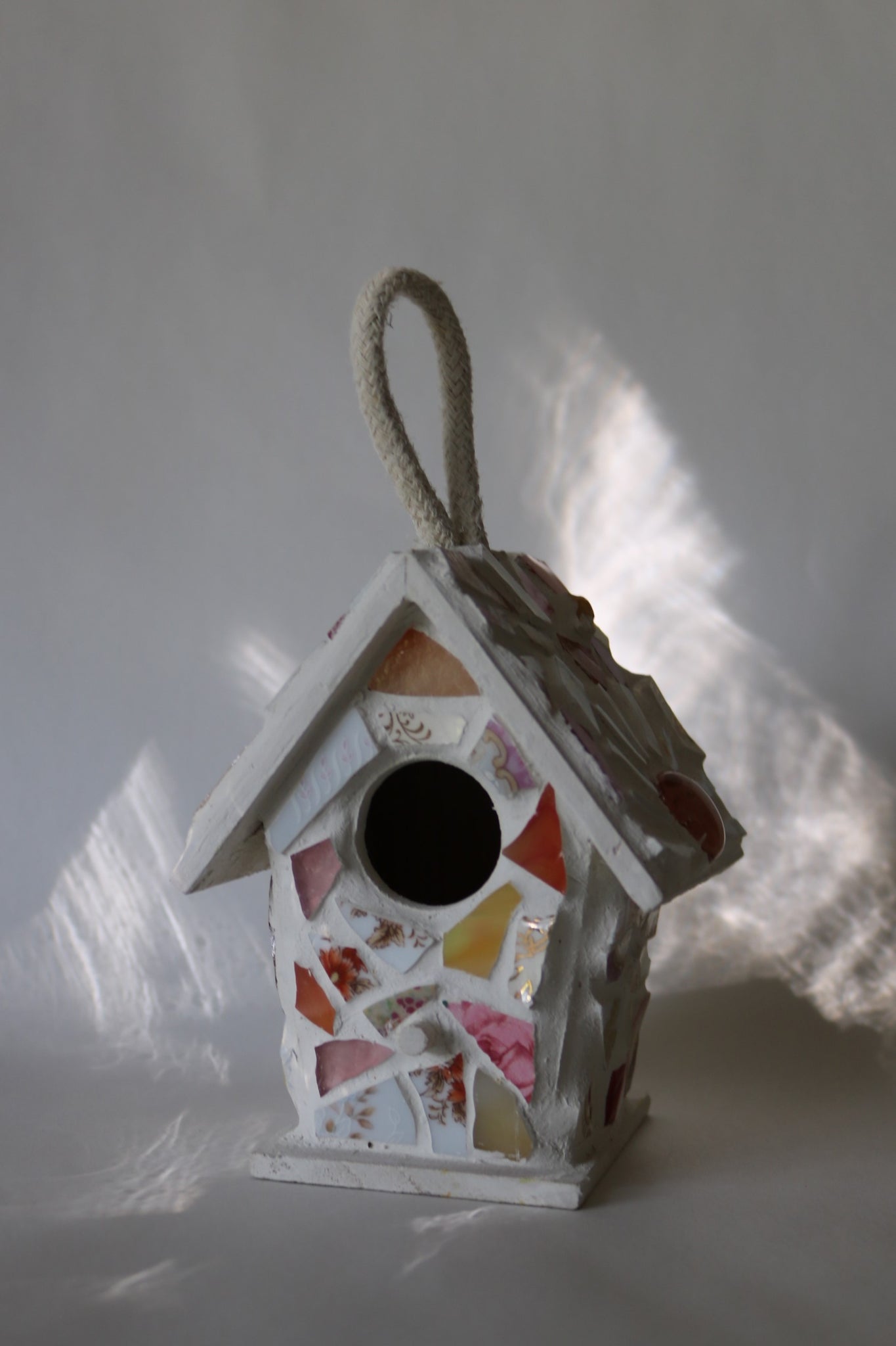 Made from upcycled china, each tile is carefully picked and placed, making a one-of-a-kind piece of art. Ideal as a gift or special décor piece, these birdhouses are durable and easy to hang or place.