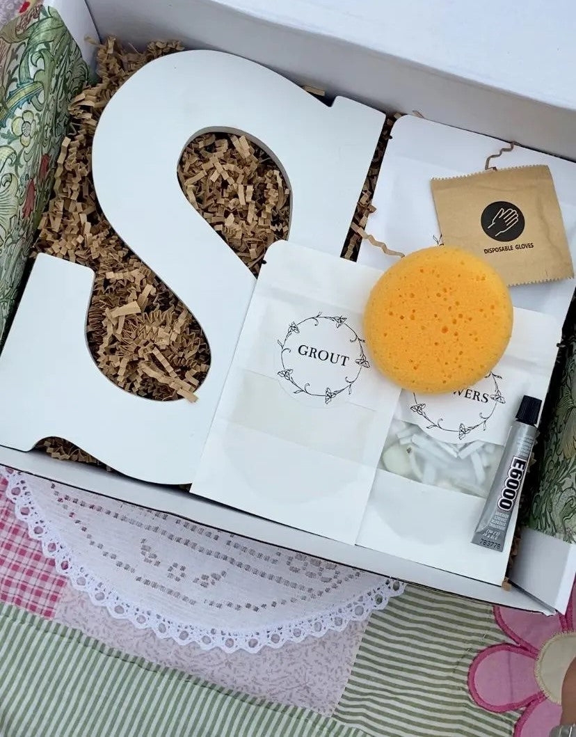Add charm to your space with this DIY mosaic letter kit! Each kit include everything you need to create your own custom initial mosaic.